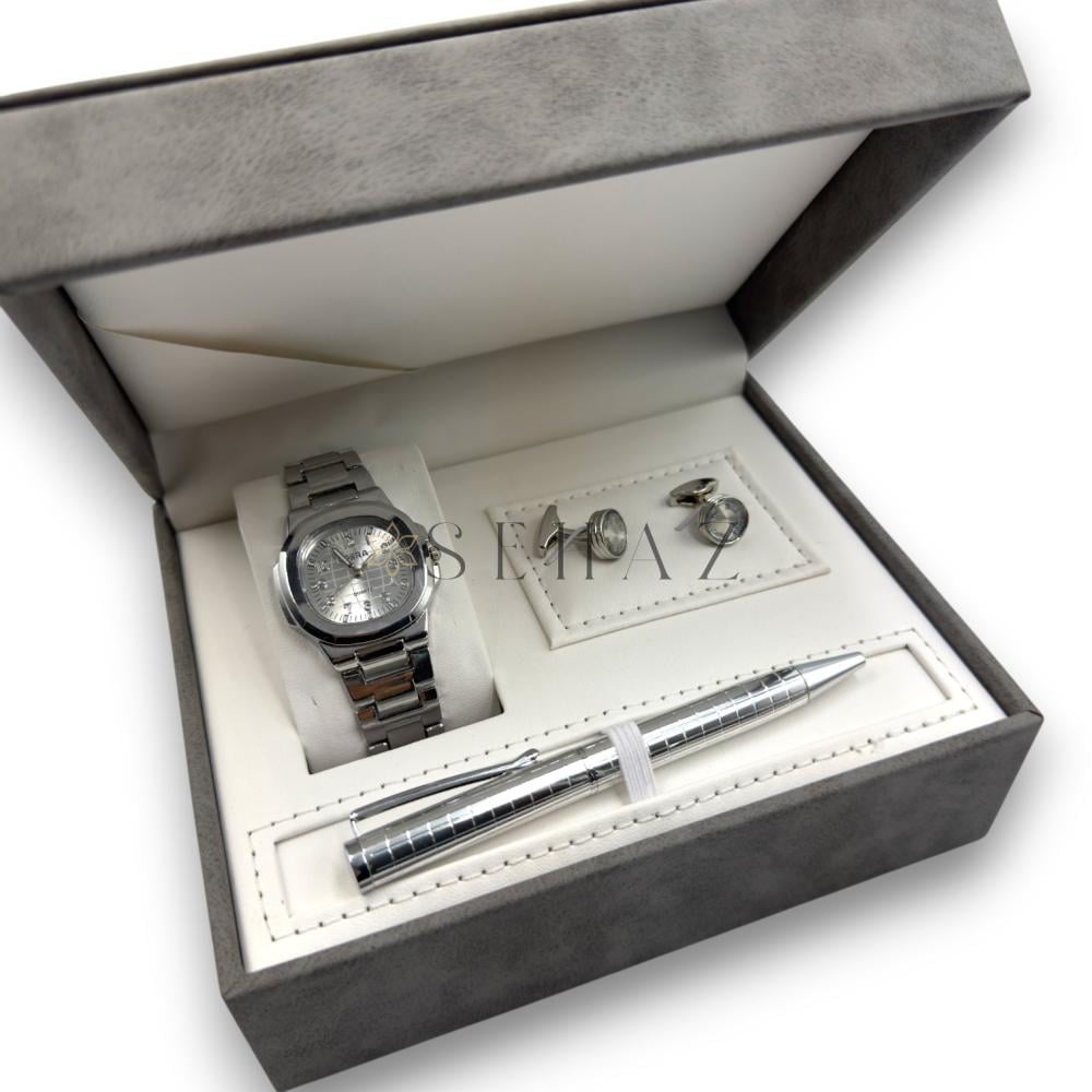 طقم ولادي (كبك-ساعة-قلم) والساعة استلس فضي مينا فضي